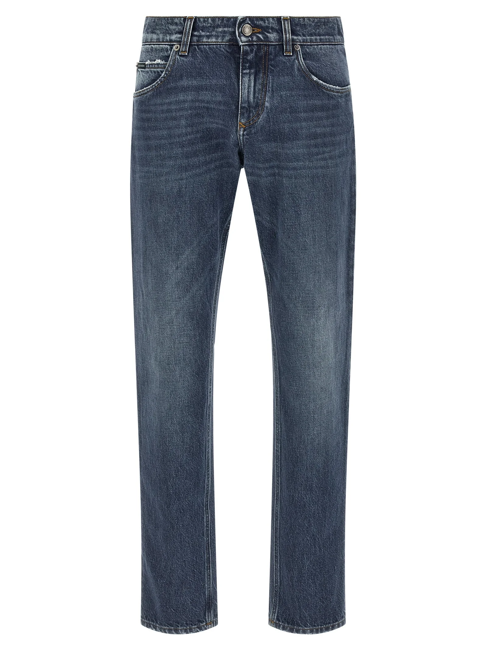 Used-effect stone washed cotton denim jeans, contrast stitching, front zip and button closure, five pockets, leather logo tag and galvanic tag with engraved logo on the back. - Colour: Blue - Composition: 100% cotton - Country Of Manufacture: Italy - Dimension: true to size fit - MPN: GYJCCDG8NZ5S9001