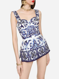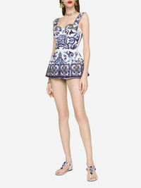 Majolica-print poplin top with peplum Bright, intense shades of blue reminiscent of the clear sky and the deep Sicilian sea, combined with the pure white of beachfront houses, inspire the Mediterranean Blue theme. This cotton poplin bustier top emphasizes the concepts of originality, lightness, and femininity that Dolce & Gabbana has always embraced. Sweetheart neckline • Sleeveless with shoulder straps • Cotton poplin lining • Zip and hook closure • The item measures 46.5 cm from the center back in size 40 IT • The model is 175 cm tall and wears size 40 IT • Made in Italy External composition: 100% Cotton Internal composition: 100% Cotton ID F71I9THH5AZ - Colour: Blue - Composition: Cotton, 100%CO - Country Of Manufacture: Italy - Dimension: KG 1 - MPN: F71I9THH5AZHA3TNMIXMAIOLICABLU