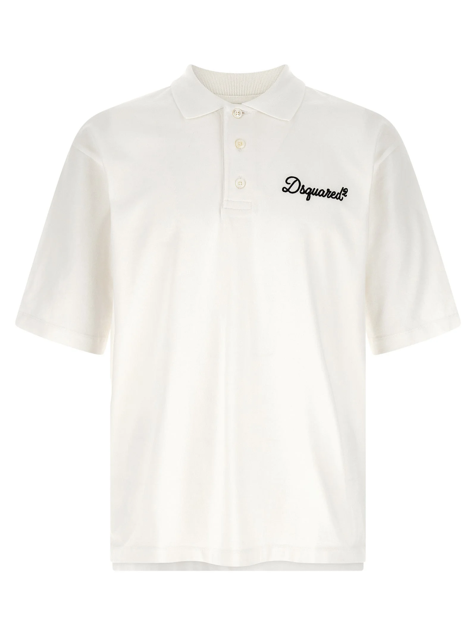 Smooth cotton jersey polo shirt with contrast 'Dsquared2 Signature' embroidery on the front, collar and buttons, short sleeves with dropped shoulders, side slits, and asymmetrical hem. - Colour: White - Composition: 100% cotton - Country Of Manufacture: Portugal - Dimension: Tennis fit - MPN: S74GL0100D20106100