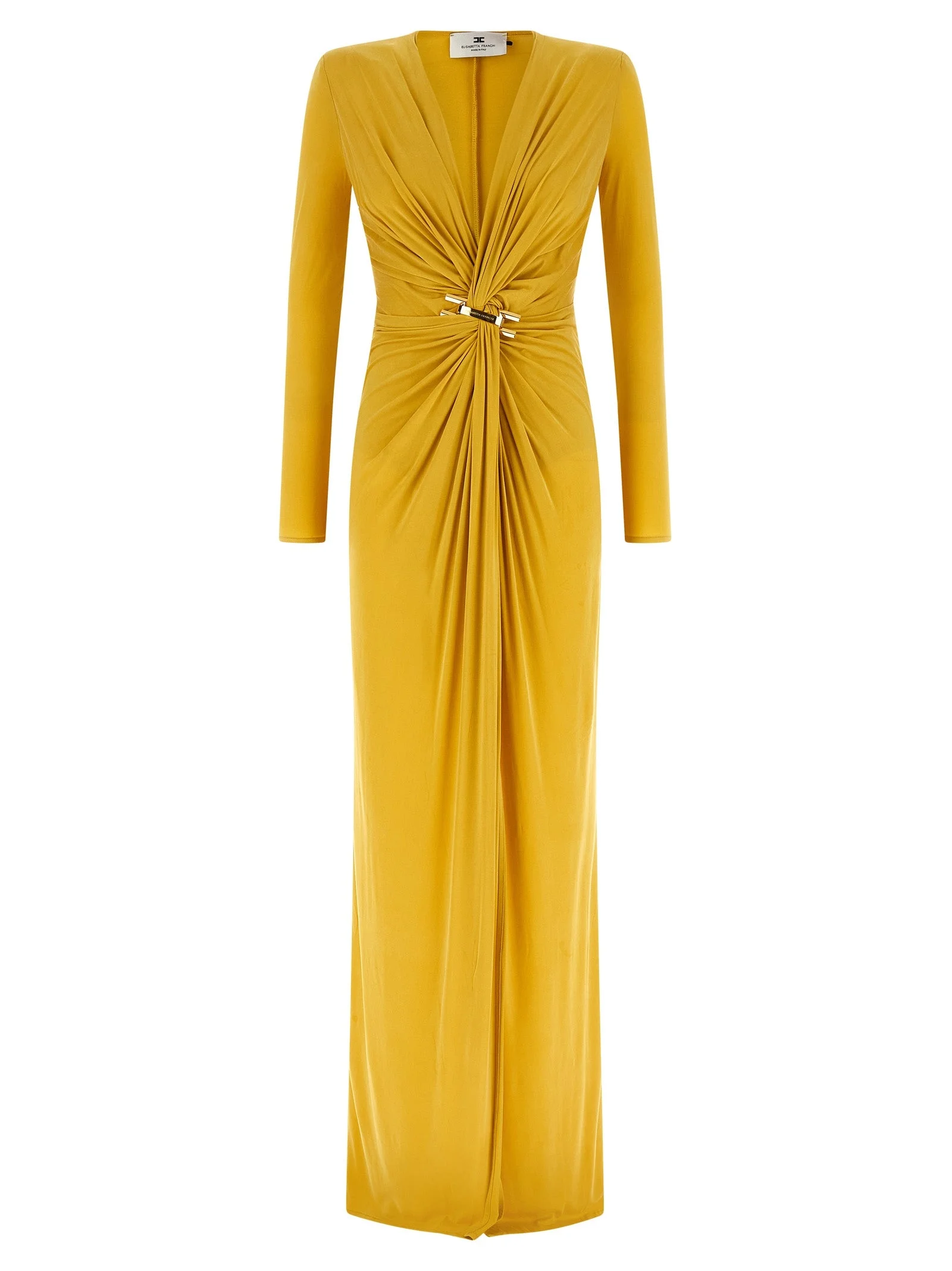 Long 'Red Carpet' dress in cupro jersey with wide front V-neck with draping, curling and jewel logo with rhinestones, padded shoulders, long sleeves, skirt with train and wide front split. - Colour: Yellow - Composition: 92% cupro, 8% elastane - Country Of Manufacture: Italy - Dimension: Slim fit - MPN: ABR2961E2EV4