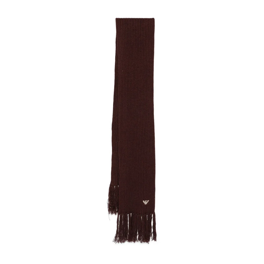 brown ribbed knit fringed edge embroidered logo - Colour: Brown - Composition: Cotton: 30.0%, Polyamide: 45.0%, Virgin Wool: 25.0% - Country Of Manufacture: China - Dimensions: length: 270.0 centimetres, width: 30.0 centimetres - MPN: AF17000EM003651U6279