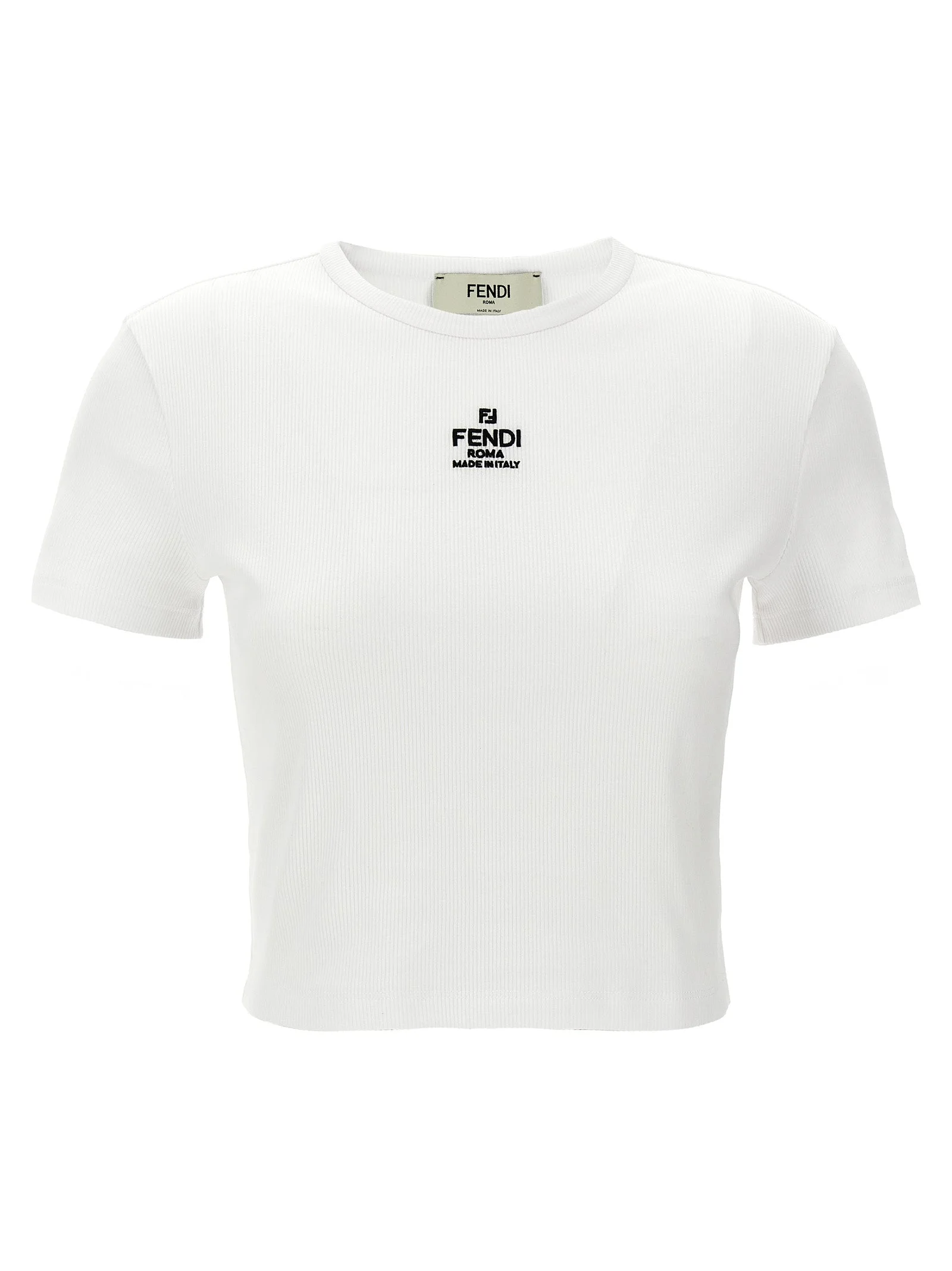 'Fendi' ribbed cotton cropped t-shirt with front logo embroidery, crew neck, short sleeves. - Colour: White - Composition: 94% cotton, 6% elastane - Country Of Manufacture: Italy - Dimension: true to size fit - MPN: FS8110ANQMF0ZNM