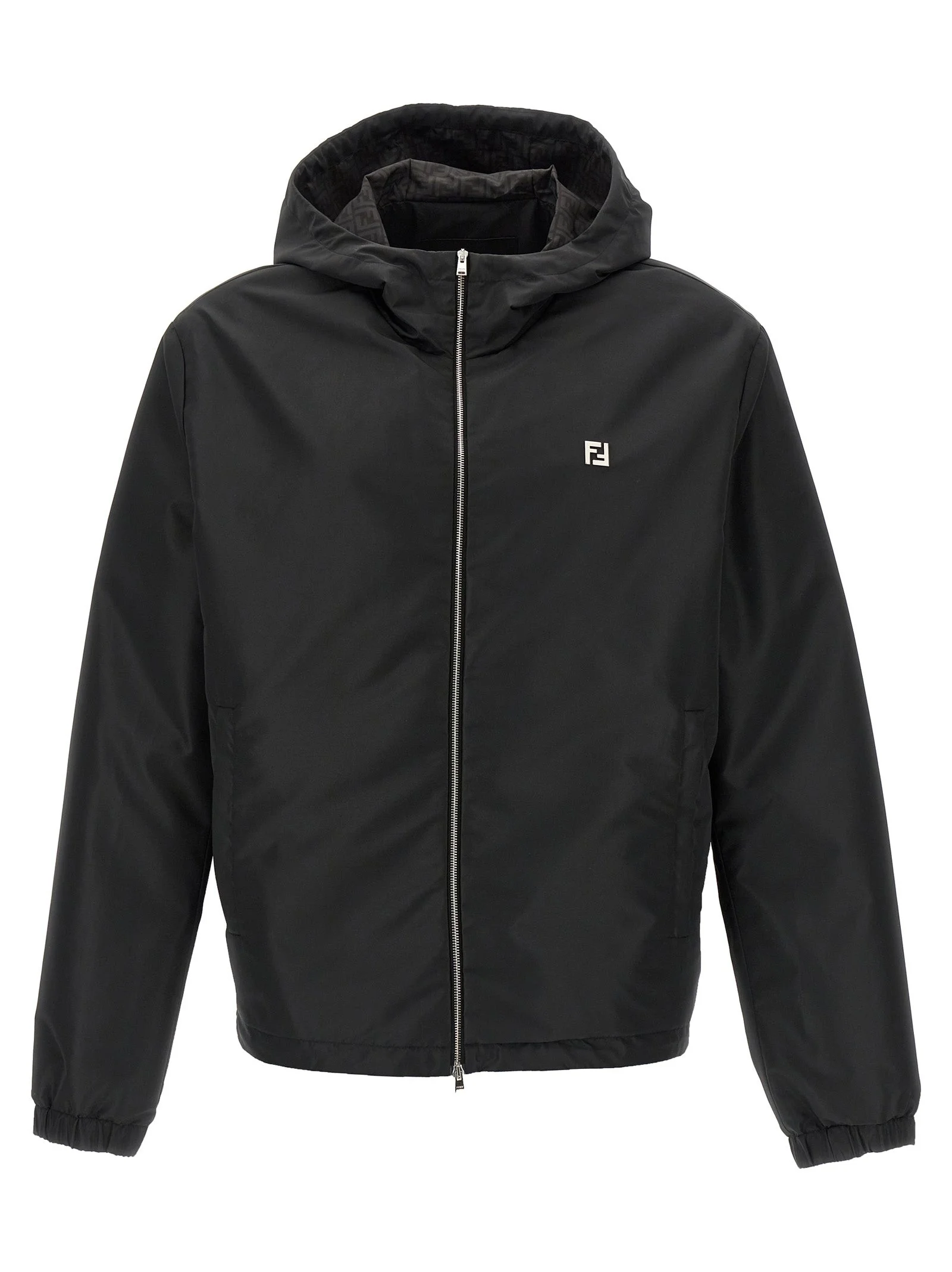 Tech fabric blouson, all-over monogram logo print lining, metal logo applique on the front, hood with adjustable drawstring, front zip closure, pockets, long sleeves with elastic cuffs, drawstring at the hem. - Colour: Black - Composition: 100% polyester - Country Of Manufacture: Italy - Dimension: true to size fit - MPN: FAA960AU94F0GME