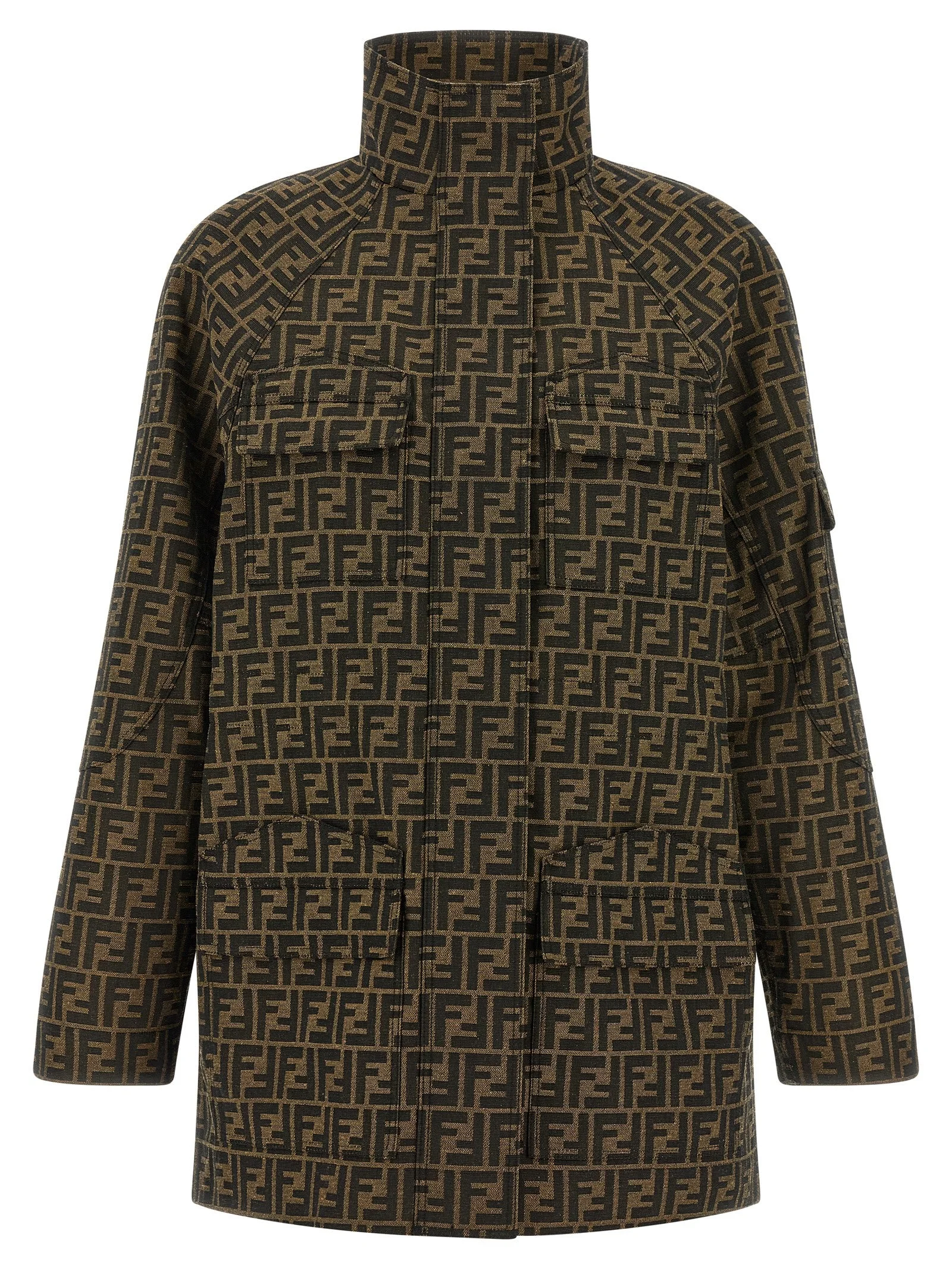 Jacquard canvas jacket with iconic FF pattern, Saharan model, standing collar, zip closure and front snap buttons, drawstring at the waist, pockets, long raglan sleeves. - Colour: Brown - Composition: 65% polyester, 35% cotton - Country Of Manufacture: Italy - Dimension: true to size fit - MPN: FJ7817A5W3F118W