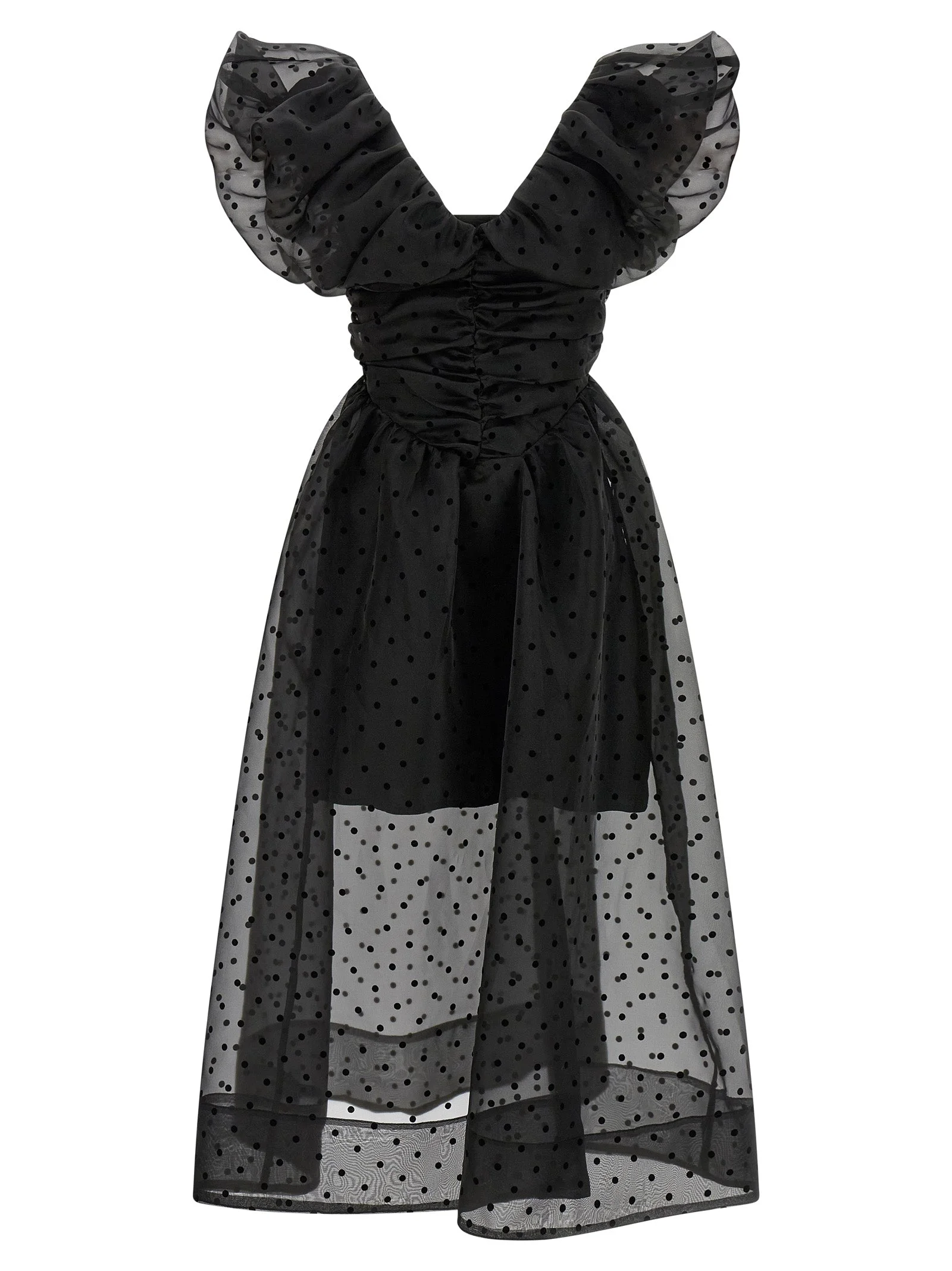 'Black Organza Ruched' midi dress in semi-transparent polka dot organza, V-neck and curled bodice front and back, short puff sleeves, side zip closure, viscose petticoat with thin removable straps. - Colour: Black - Composition: 100% recycled polyester - Country Of Manufacture: China - Dimension: slim fit - EU size - MPN: A1030107099