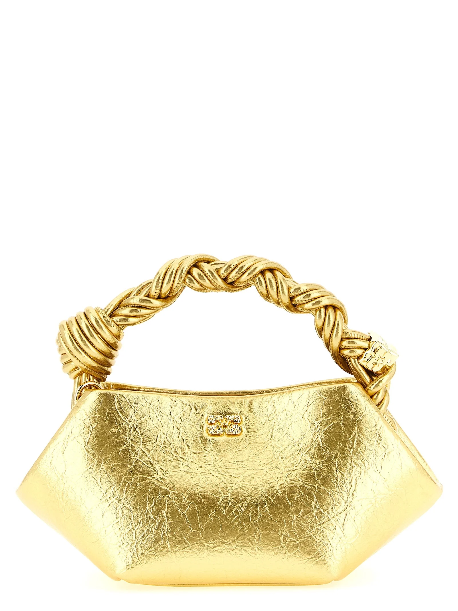Bou' mini handbag in craquele metallic leather-effect fabric, tone-on-tone metallic 'Ganni Butterfly' logo on the front, inner magnetic closure, fixed braided handle with tone-on-tone metal knot and nut, adjustable and removable shoulder strap, and back embossed logo. SUSTAINABLE: product made from recycled materials. - Colour: Gold - Composition: 60% polyurethane, 40% polyester - Country Of Manufacture: China - Dimension: W 25 x H 11 x D 11.5 cm - MPN: B2100030339