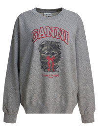 Ganni "Margot Kitty Print" crewneck sweatshirt, constructed of cotton fabric with a compact knit structure. The silhouette is regular, with a straight cut on the shoulders and ribbed trim on the round neckline, cuffs and bottom. The design features long sleeves and a front graphic print with kitten-themed illustration and text. Ganni logo placed on the front, integrated into the design. - Front Ganni logo - Kitten print and text "Have a nice day! Please recycle" - Ribbed round neckline - Long sleeves - Cotton - Regular fit - Colour: Grey - Composition: 100% cotton - Country Of Manufacture: Portugal - Extra Description: LogoRegular fit;Long sleeves - MPN: A1060016920