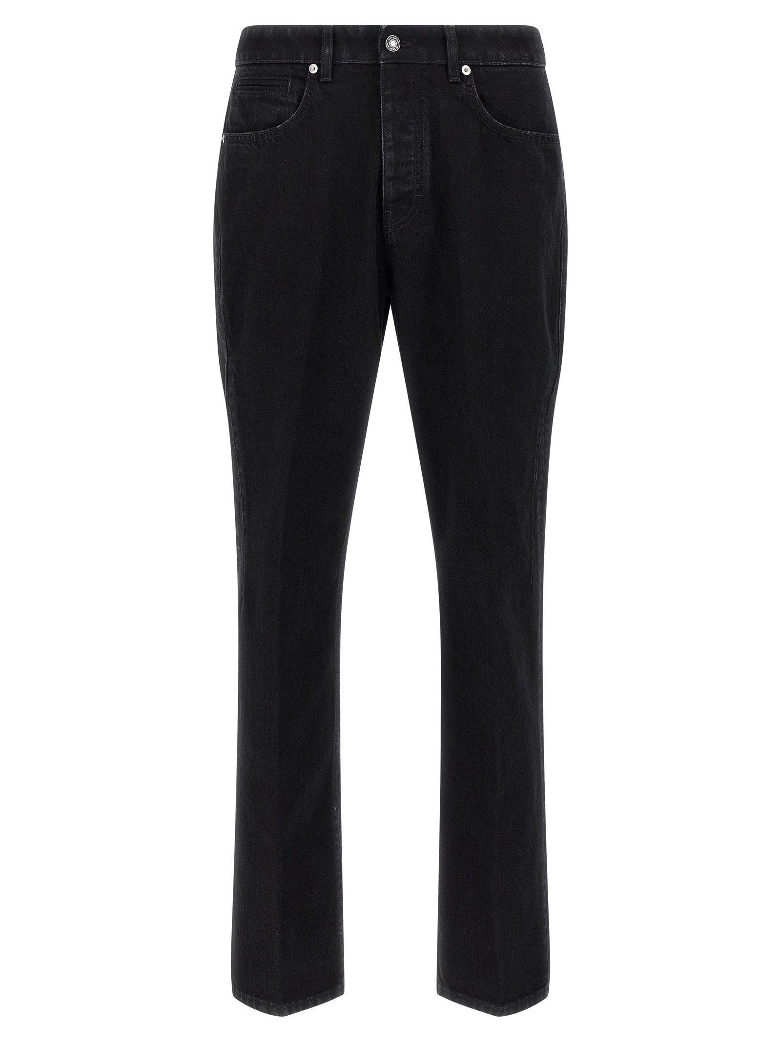 Used-effect garment-dyed cotton denim jeans with straight leg, front button closure, ironed pleat, five pockets, logo embroidery and tone-on-tone suede logo tag at the back. - Colour: Black - Composition: 99% cotton, 1% elastane - Country Of Manufacture: Italy - Dimension: true to size fit - MPN: BM51MK516K001