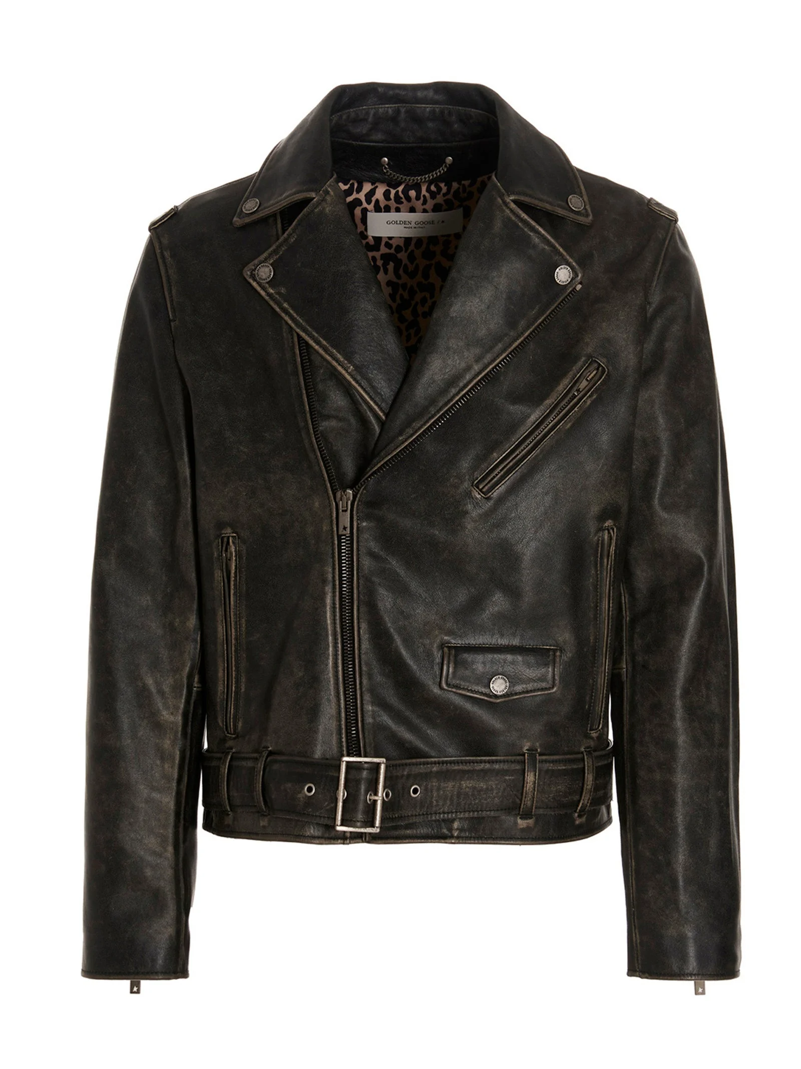 'Golden' vintage effect leather biker jacket with distressed details, oblique zip closure, belt and antiqued metal details. - Colour: Black - Composition: 100% calfskin leather - Country Of Manufacture: Italy - Dimension: true to size fit - MPN: GMP00297P0006479010090100