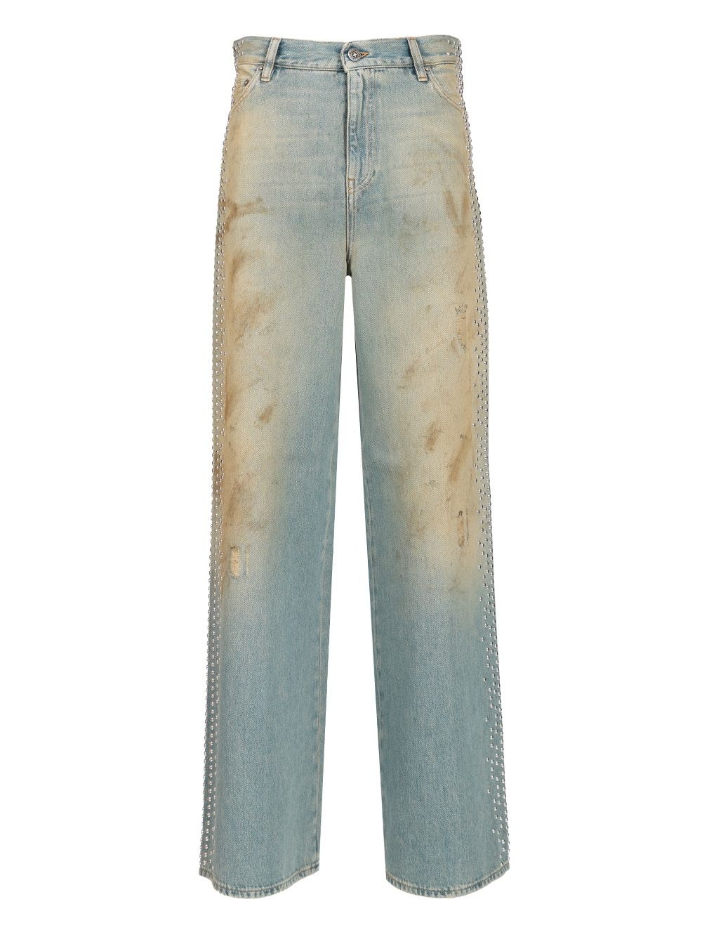 Women's boyfriend jeans with a lived-in effect sand wash and studs