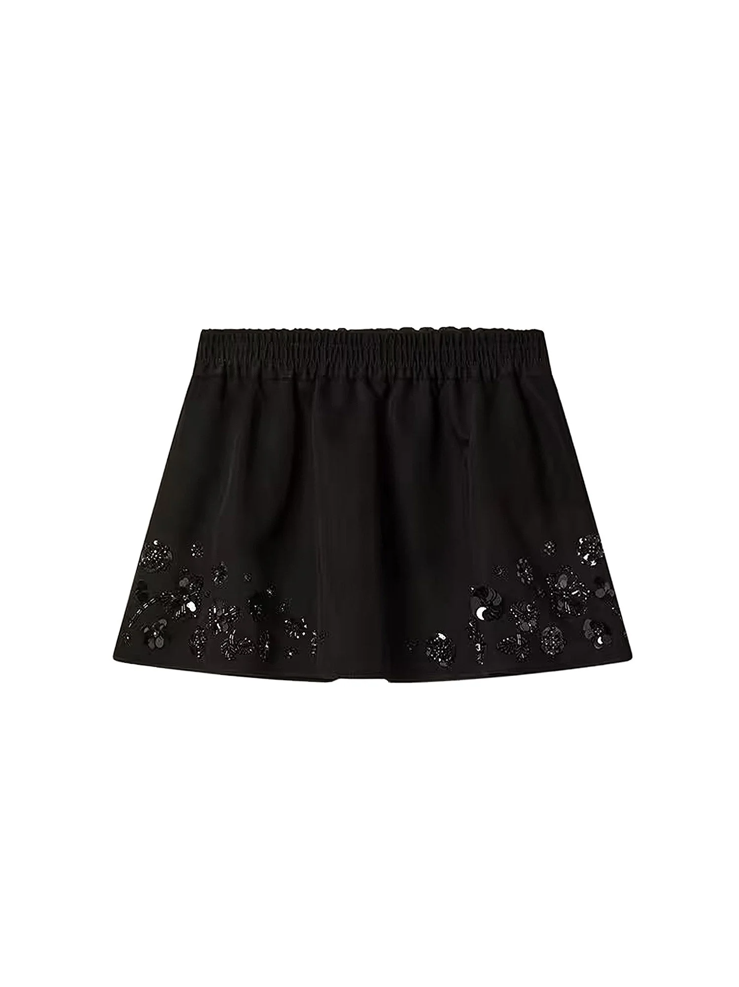 Women’s miniskirt in black cotton twill with floral sequin embroidery