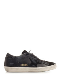 "Super-Star" sneakers in black nappa leather with vintage treatment from Golden Goose, with black suede star and tongue, black glitter heel tab and black laces. - Colour: Black - Composition: OVINE LEATHER 64%; COW LEATHER 32%; POLYETHYLE - Country Of Manufacture: IT - MPN: GWF00101F00346390100