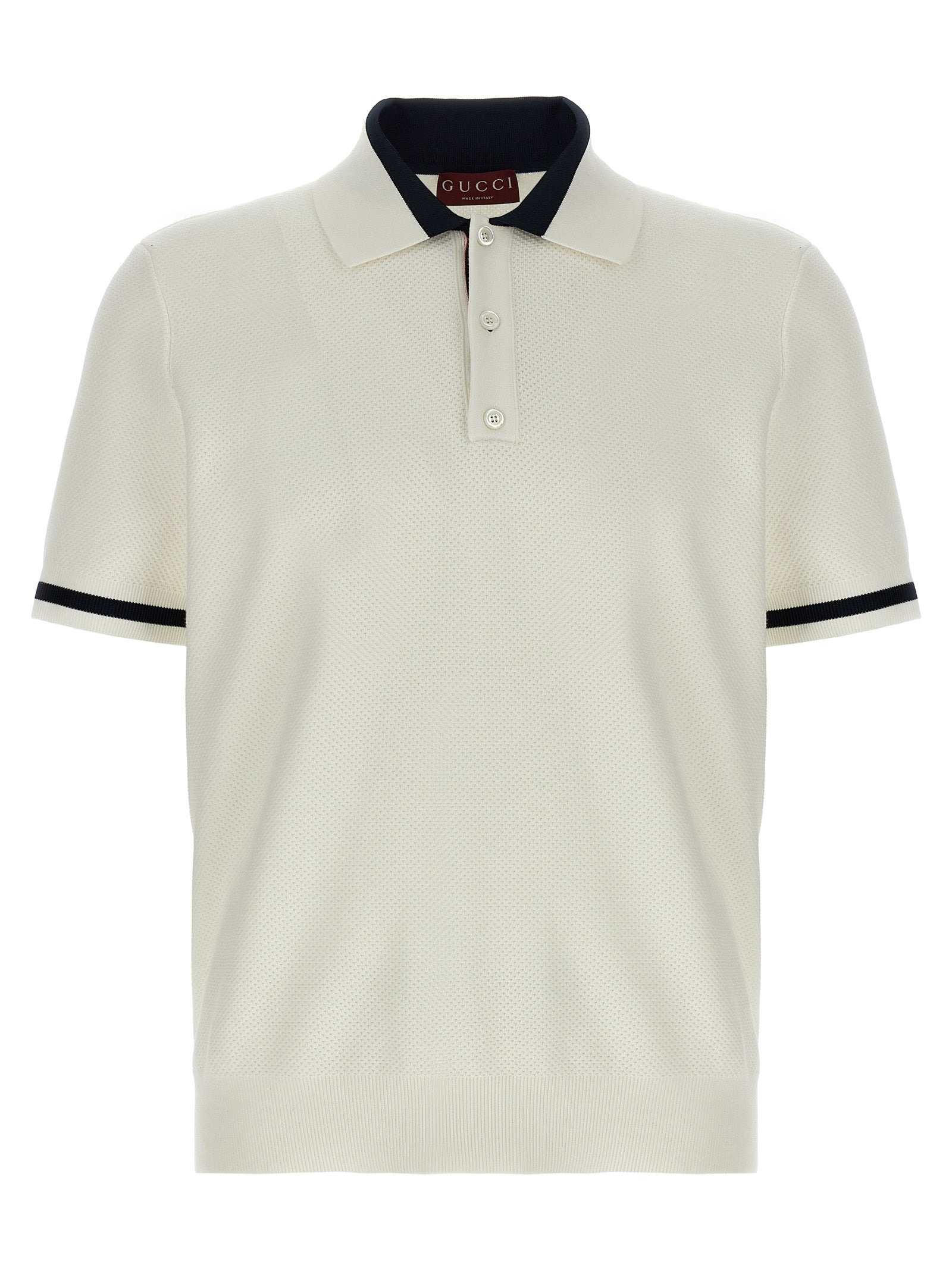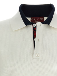 Knitted cotton pique polo shirt with contrast details, collar and buttons with Gucci intarsia detail, short sleeves. - Colour: White/Black - Composition: 100% cotton - Country Of Manufacture: Italy - Dimension: true to size fit - MPN: 787814XKD209983
