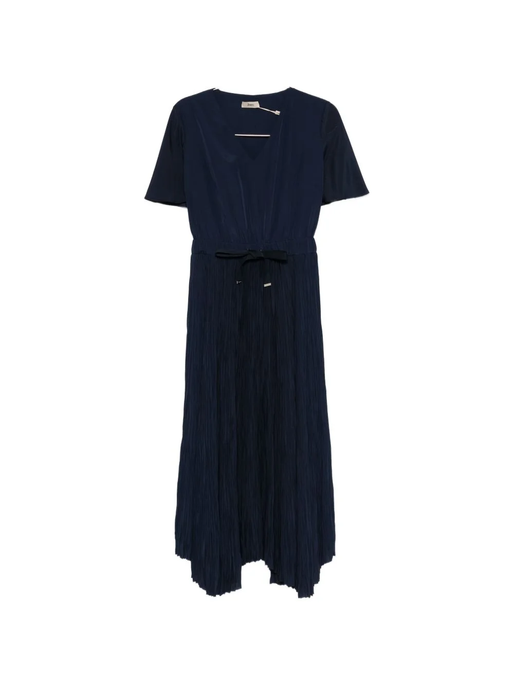navy blue pleated skirt V-neck short sleeves drawstring waist midi length - Colour: Blue and green - MPN: AB000084D128919200