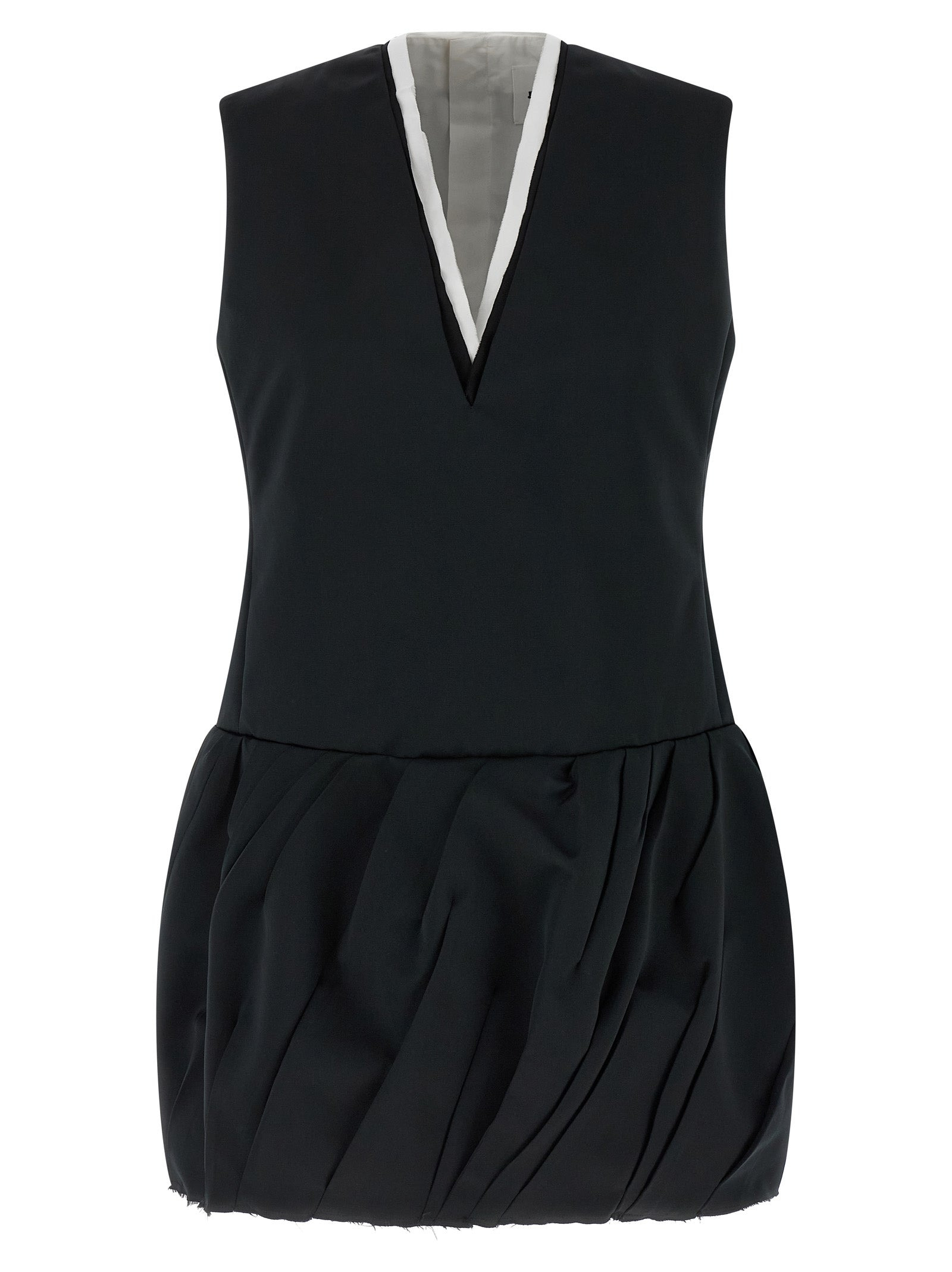 '240' technical duchesse mini dress, V-neck with several layers of contrasting fabric, sleeveless, balloon skirt with irregular pleats, raw cut hem and back zip closure. - Colour: Black - Composition: 100% polyester - Country Of Manufacture: Italy - Dimension: true to size fit - GERMAN size - MPN: J03CT0520J70210001