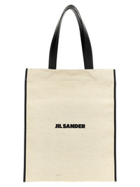Medium 'Flat' canvas shopping bag with leather details, front logo print, double handle. - Colour: White/Black - Composition: 85% cotton 9% acrylic 6% of - Country Of Manufacture: Italy - Dimension: W 40 x H 49 cm - MPN: J26WC0018P7060280