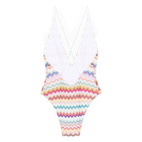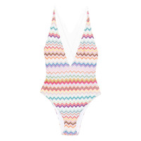 One-piece swimsuit in lamé viscose with pixel-effect zigzag pattern and V-neckline