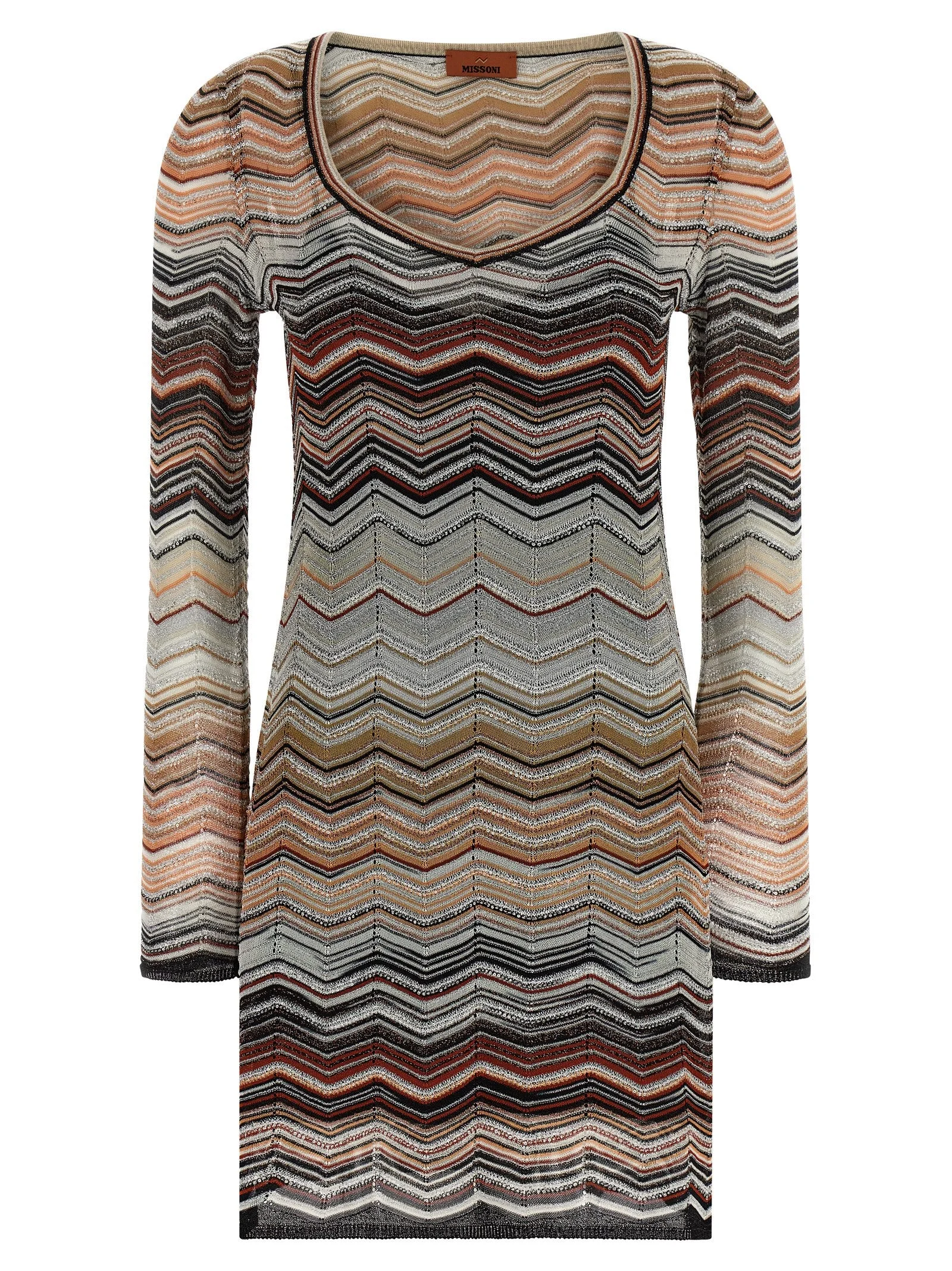 Chevron lame viscose mini dress with all-over sequin applique, slightly flared silhouette, wide front neckline, long sleeves, petticoat with thin straps. - Colour: Brown - Composition: 75% vi, 14% pa, 11% me - Country Of Manufacture: Italy - Dimension: true to size fit - MPN: DS26SG23BK01H9SM9ZV