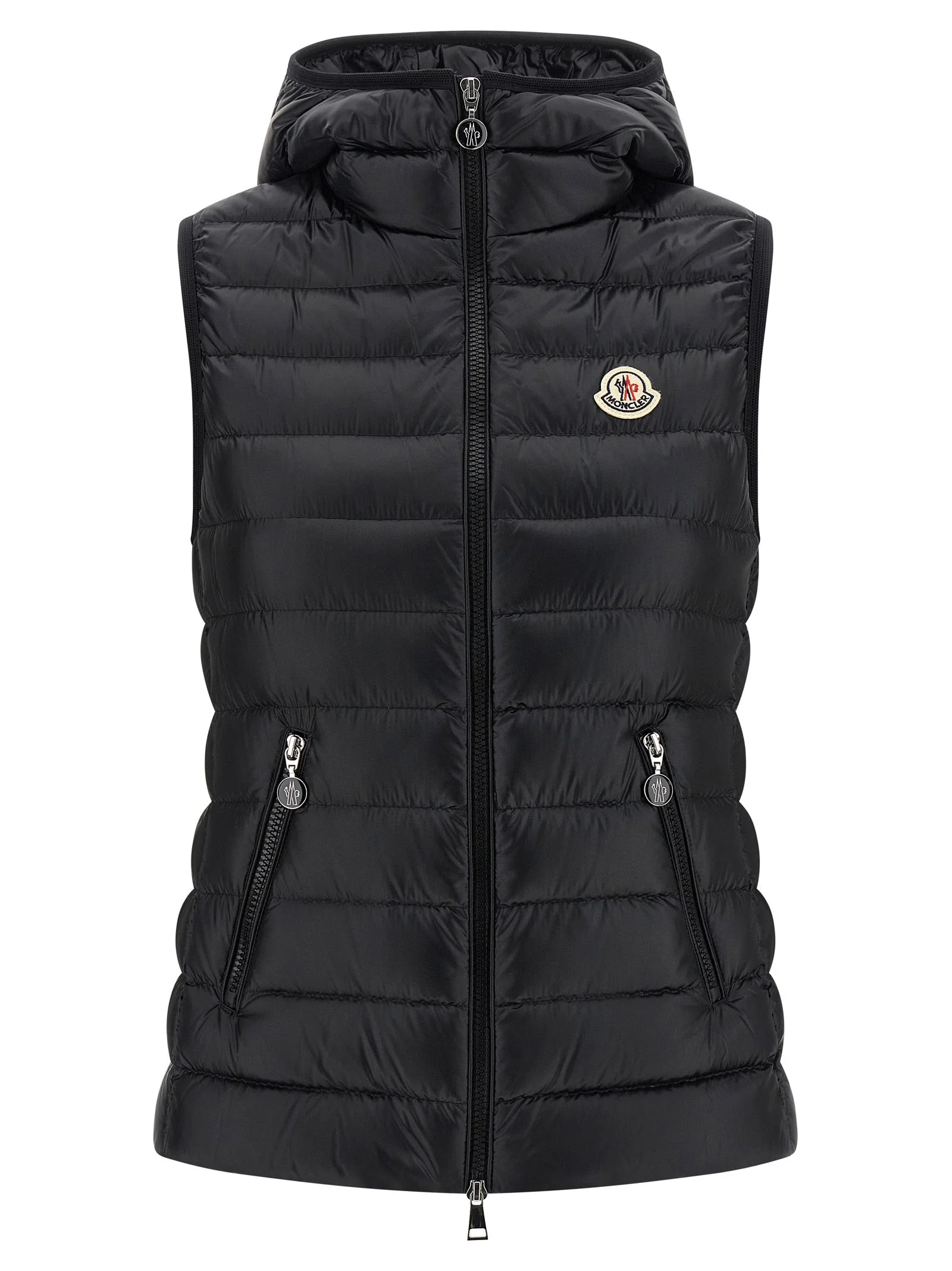 'Glygosse' quilted and goose feather padded vest in saison longue, hood, high neck, felt logo patch and front zip closure, pockets. - Colour: Black - Composition: 100% polyamide - Country Of Manufacture: Italy - Dimension: Slim fit - MPN: L10931A00098597YG999
