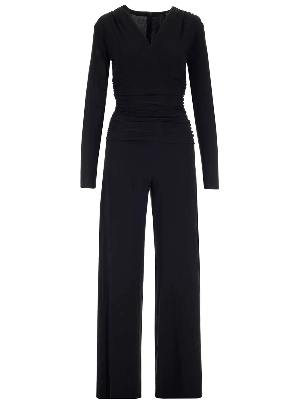 Black jersey jumpsuit from Norma Kamali with long sleeves, criss-cross V-neck, slim fit, straight leg trousers. - Colour: Black - Composition: 95% polyester 5% spendex - Country Of Manufacture: CN - MPN: KK326JPL335001BLACK