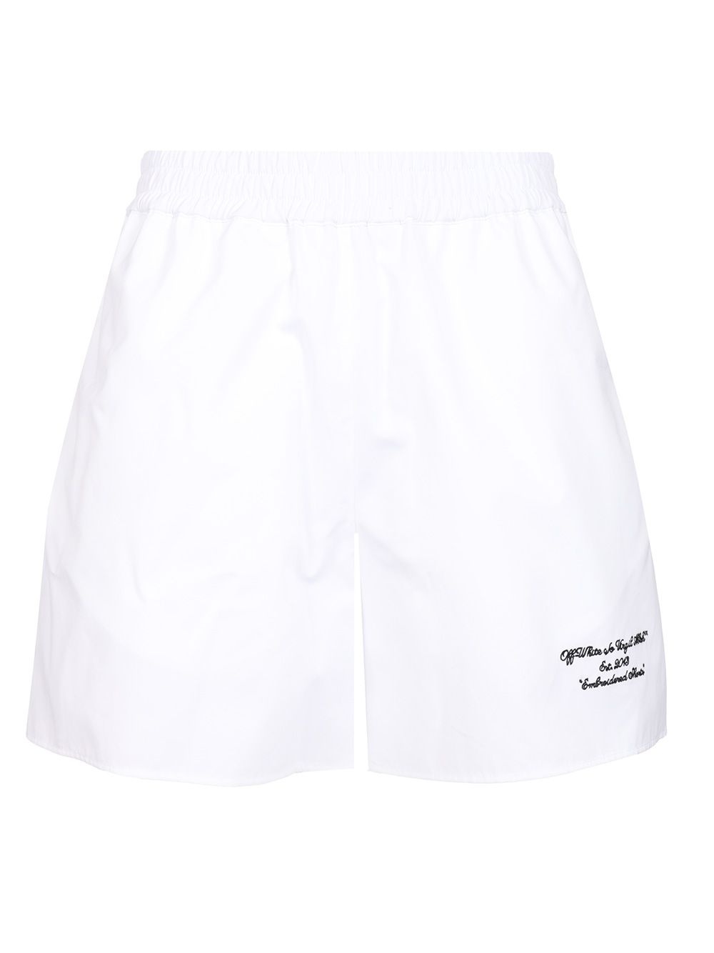 Off-White cotton popeline boxer-style shorts with elasticated waist and contrasting decoration on the front. - Colour: White - Composition: FABRIC 100% COTTON - Country Of Manufacture: IT - MPN: OWCB05DS25FAB0010110