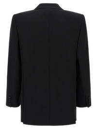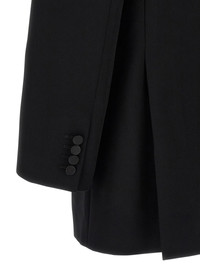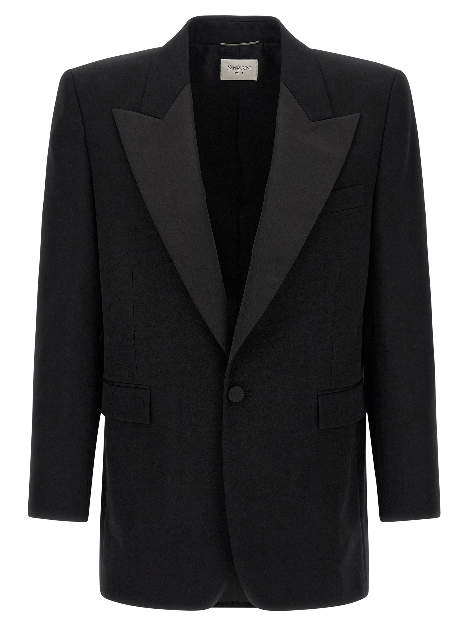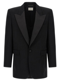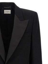 'Smoking' single-breasted blazer in grain de poudre wool with front button closure, tone-on-tone satin peak lapels, breast pocket, flap pockets, two inner pockets, maxi padded shoulder strap, buttonhole cuffs, back vents, silk lining. - Colour: Black - Composition: 100% wool - Country Of Manufacture: Italy - Dimension: true to size fit - MPN: 844999Y7E631000