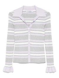 Grey Striped Ribbed Sweater Express your preppy chic style with this striped ribbed cardigan, with its contrast collar and flared sleeves. Wear it with tailored trousers for the office and with minis for a romantic date. True to size The fabric is stretchy Front opening with diamond buttons Flared sleeves Composition Main fabric: 53% Viscose 47% Polyester Collar: 69% Viscose 20% Polyester 10% Polyamide 1% Elastane ID PF25047TAGR - Colour: Grey - Composition: Viscose, MAIN:53%VIS 47%PES COLLAR:69%VIS 20%PES 10%PA 1%EA - Country Of Manufacture: China - Dimension: KG 0,5 - MPN: PF25047TAGRGREY