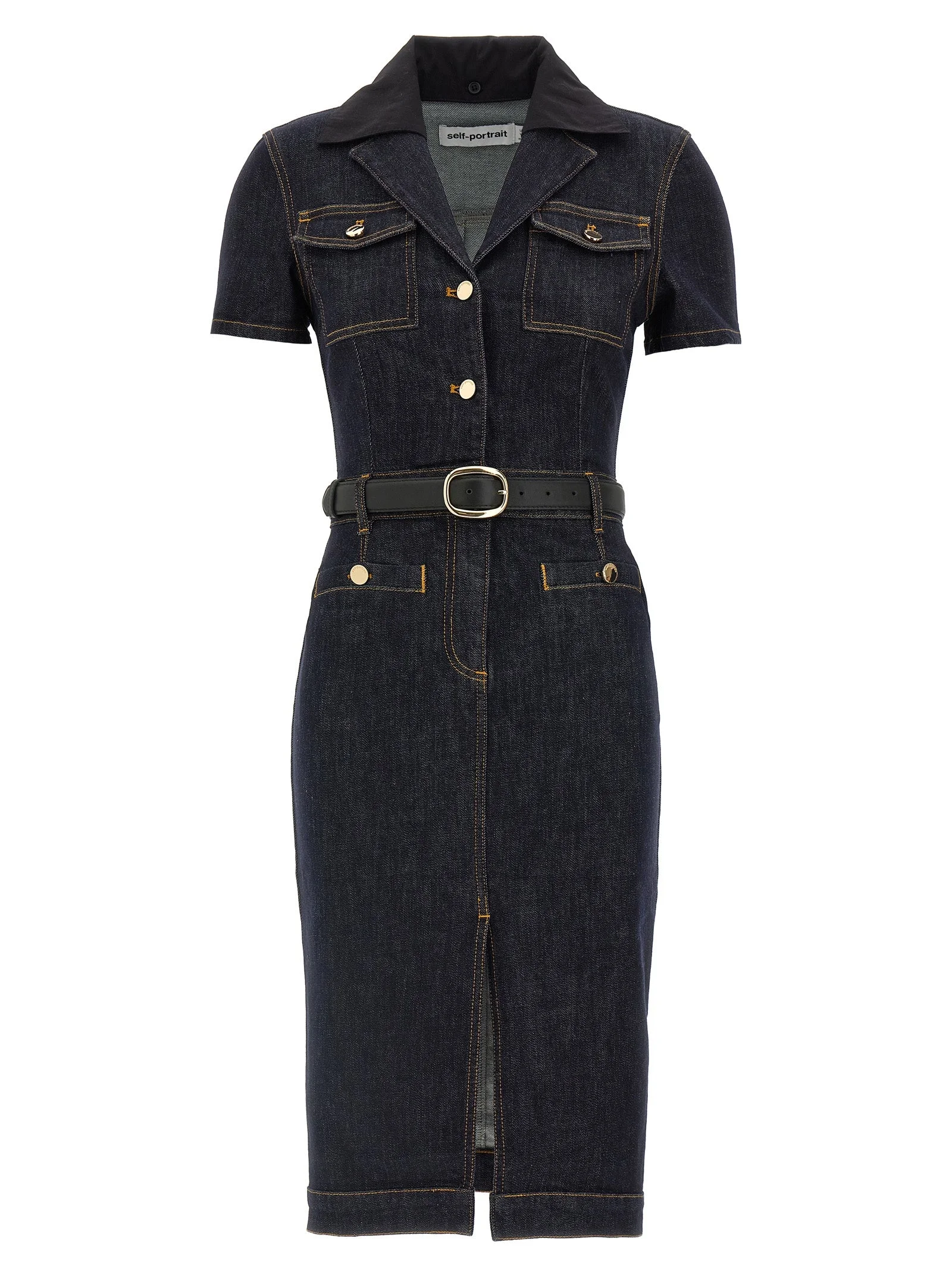Streetwise 'Indigo Denim Midi' cotton denim dress with contrast stitching, shirier style, collar with removable contrast cotton insert, V-neck, front metal button closure, pockets, zip flap, short sleeves, front split, unlined, removable leather belt. - Colour: Blue - Composition: 94% cotton 5% polyester 1% elastane - Country Of Manufacture: Hong Kong - Dimension: slim fit - UK size - MPN: RS26822MBLBLUE