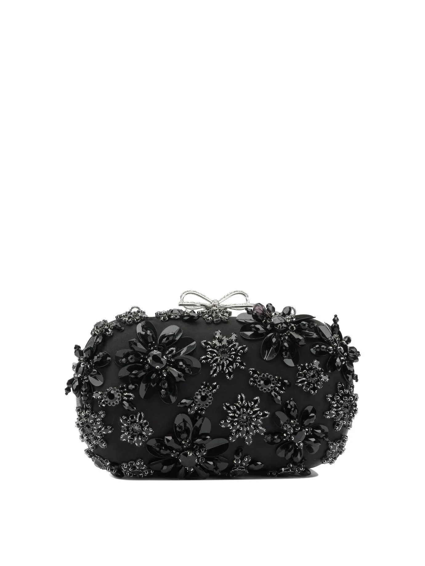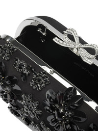 Satin clutch bag with Self-portrait crystals, made from a smooth satin main fabric, features a rigid and compact structure. The top lining is decorated with beaded floral embroidery and embossed applied crystals. A distinctive bow, the brand's signature element, is applied to the front. The silhouette of the bag is essential, with sharp geometric lines and a construction without visible seams. - Satin lining - Floral embroidery in beads and crystals - Top closure - Applied bow detail on the front - Rigid structure - Colour: Black - Composition: 100% polyester - Country Of Manufacture: China - MPN: RS26304BBLACK