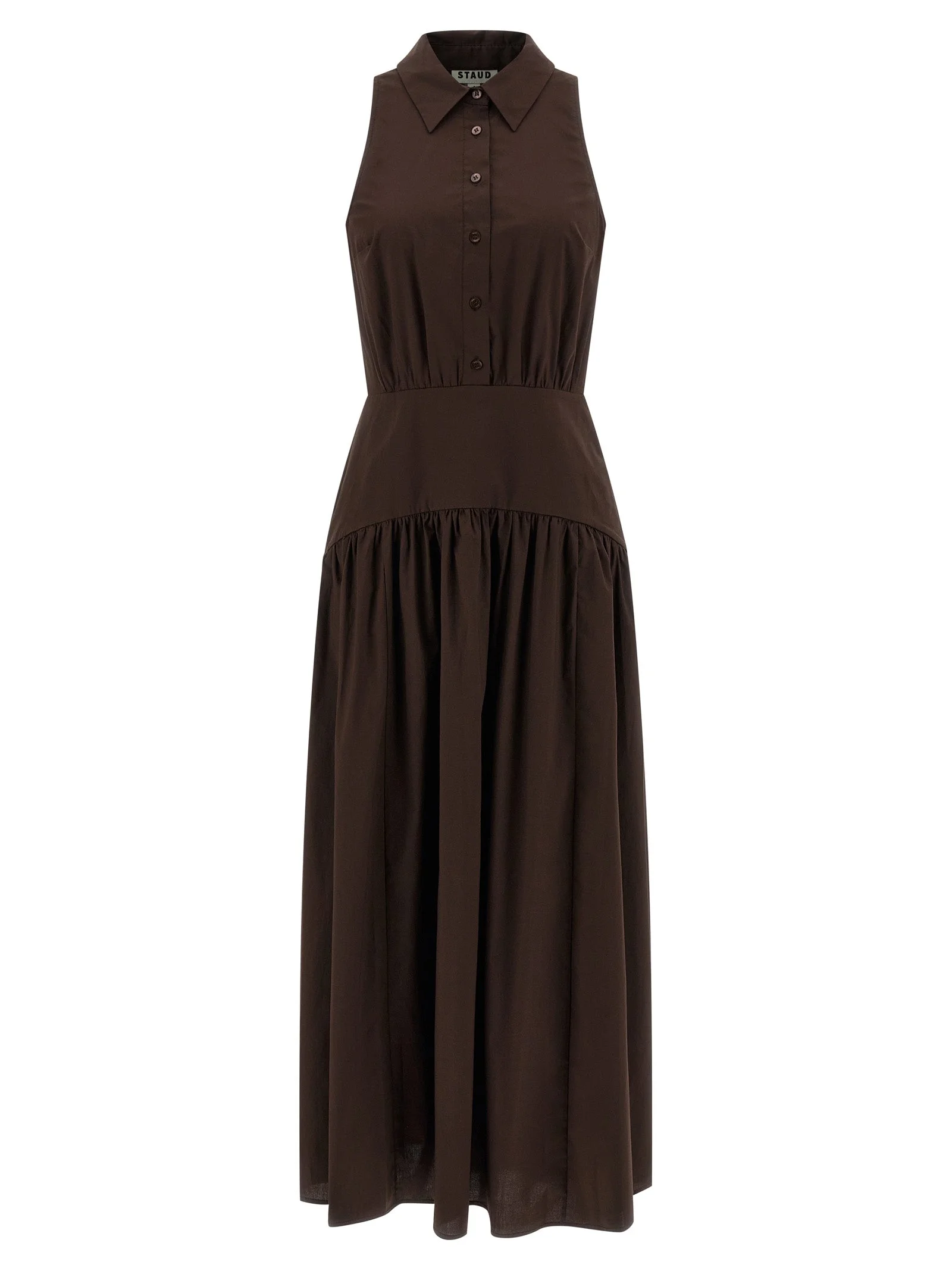 'Romy' dress in cotton poplin, chemisier model, collar, front button closure, wrinkled at the waist with wide skirt, sleeveless. - Colour: Brown - Composition: 98% cotton, 2% elastane - Country Of Manufacture: China - Dimension: True to size fitUS size - MPN: R25S2245POEART