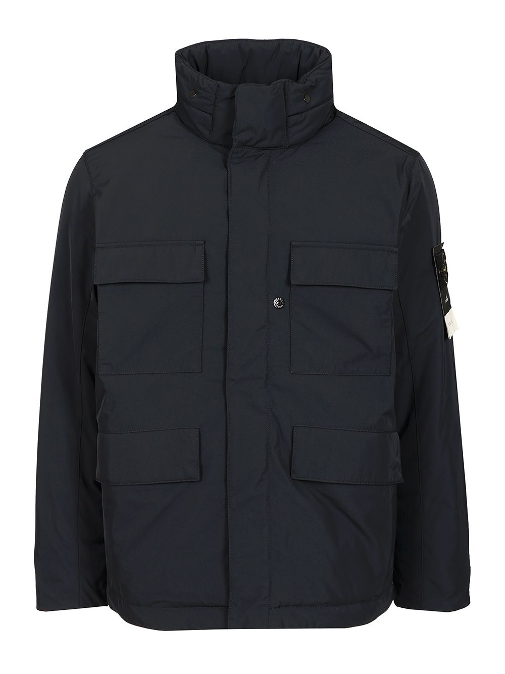 Padded field jacket in micro twill. Hood with fixed drawstring hidden in the stiff collar with snap button. Two chest pockets and two patch pockets with two snaps under the flap. Internal vertical pocket along the placket with snap visible on the outside; second internal pocket with button and embroidered Compass logo. Stone Island badge on the left sleeve. Elasticated ribbed cuff inside. Double slider zip under placket with snaps. - Colour: Blue - Composition: 100%FIBRA POLIAMMIDICA - Country Of Manufacture: ID - MPN: K2S154100049S0026V0020
