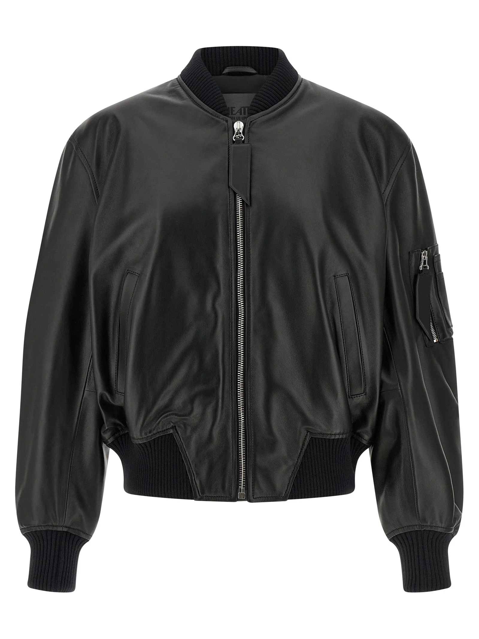 Leather bomber jacket with tone-on-tone ribbed stretch knit details, padded lining, high neck, front zip closure, pockets, long sleeves with cuffs and dropped shoulders, and headband. - Colour: Black - Composition: 100% lamb leather (Ovis aries) - Country Of Manufacture: Romania - Dimension: oversized fit - MPN: 260WCB00004100