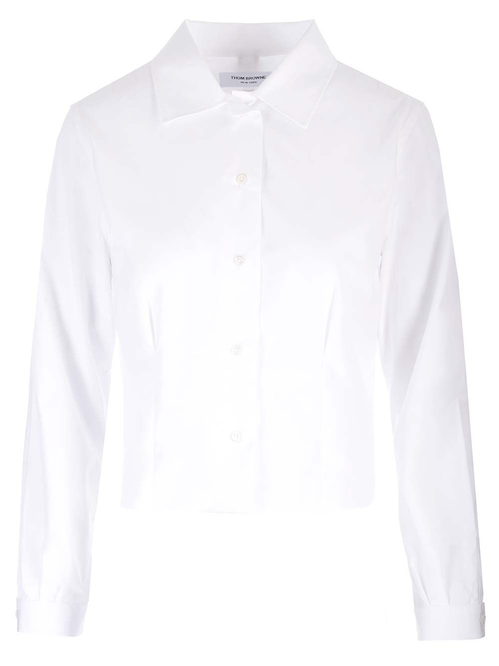 White poplin shirt from Thom Browne with cropped design, classic collar, front pleats and double button cuffs. - Colour: White - Composition: 100% COTTON - Country Of Manufacture: IT - MPN: FLL188A03113100