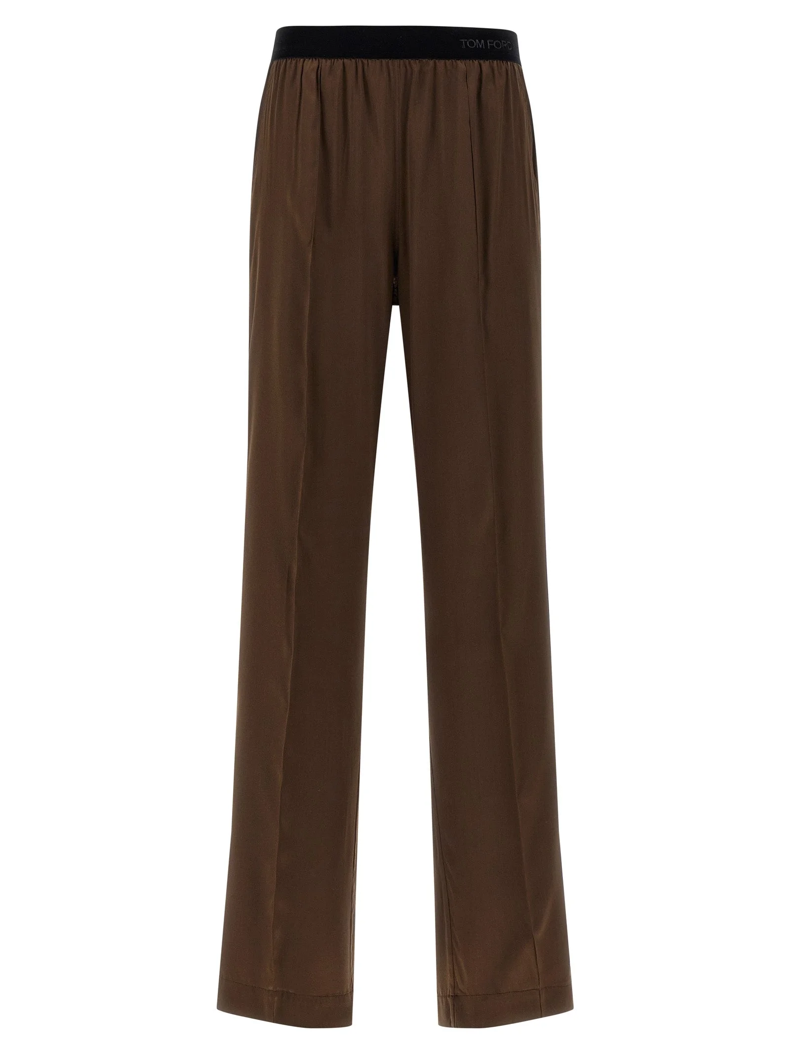 Stretch silk satin pants with pajama style, contrast velvet logo elastic band at the waist, pockets, straight leg, medium waist. - Colour: Brown - Composition: 94% silk 6% elastane - Country Of Manufacture: Italy - Dimension: true to size fit - MPN: PAW683FAX881ECD
