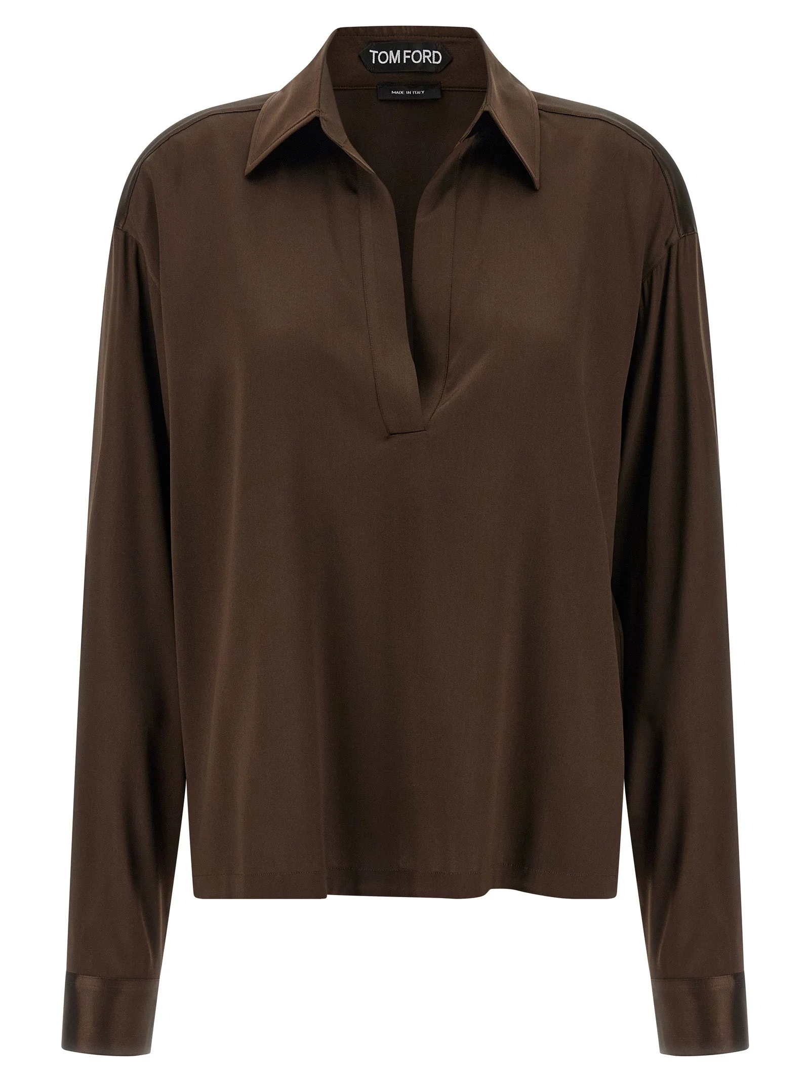 Polo shirt in stretch silk satin, collar and V-neck, long sleeves with cuffs and dropped shoulder, side slits. - Colour: Brown - Composition: 94% silk 6% elastane - Country Of Manufacture: Italy - Dimension: Relaxed fit - MPN: TS2144FAX881ECD