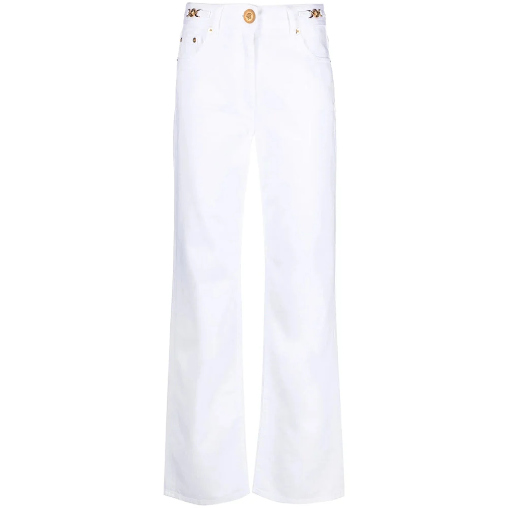 white cotton denim stonewashed Medusa '95 plaque detail logo-embossed patch to the rear belt loops front button and zip fastening logo-embossed button straight leg classic five pockets gold-tone hardware authenticity QR code - Colour: White - Composition: Outer Composition Cotton: 100.0%, Lining Composition Cotton: 35.0%, Outer Composition Calf Leather: 100.0%, Lining Composition Polyester: 65.0% - Country Of Manufacture: Italy - MPN: 1A0857010137451D110