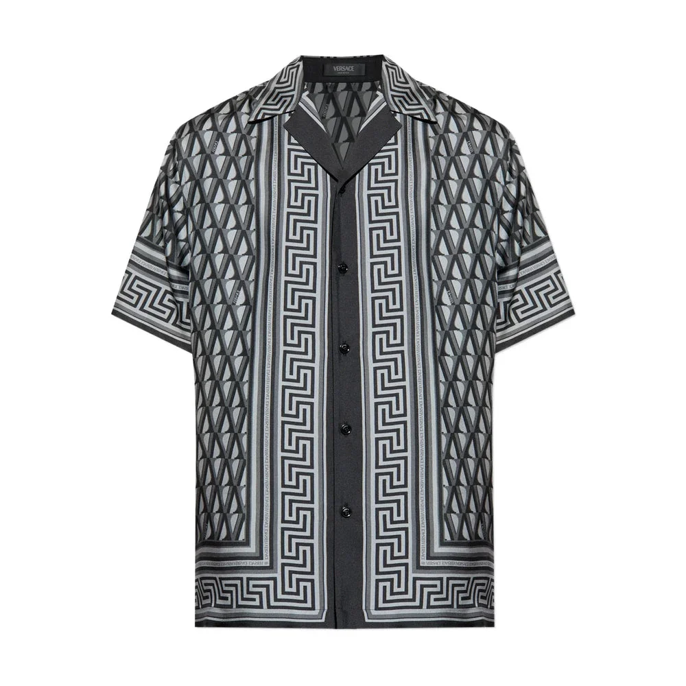 grey/black monogram pattern signature Grecca trim button fastening short sleeves camp collar silk - Colour: Gray, Black - Composition: Outer Composition Silk: 100.0% - Country Of Manufacture: Italy - MPN: 1A1678510227405E720 - Size Family: IT