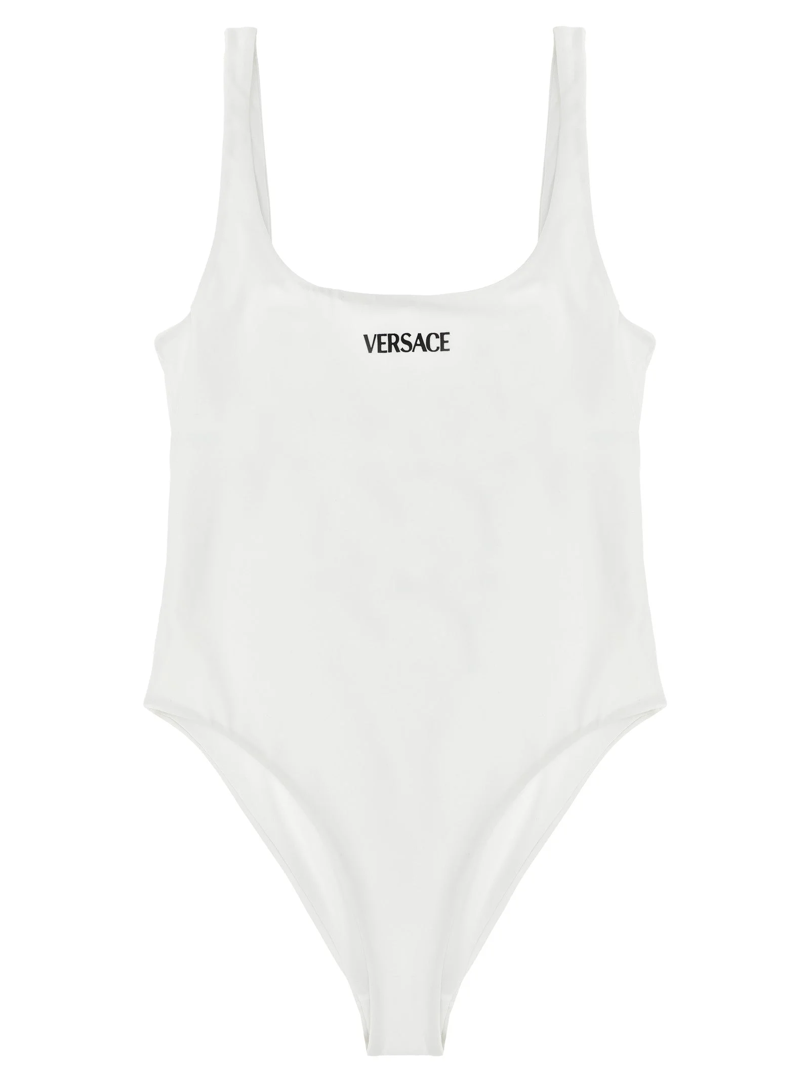 Lycra one-piece swimsuit, rubber 'Versace Logo' at the front, round neckline at the front, wide round neckline at the back. SUSTAINABLE: Product made with recycled materials. - Colour: White - Composition: 78% nylon, 22% elastane - Country Of Manufacture: Italy - Dimension: true to size fit - MPN: 10231621A171521W010