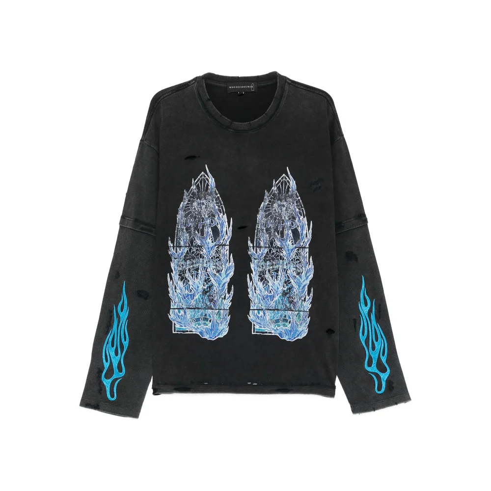dark grey graphic print flame design round neck long sleeves distressed detail - Colour: Gray, Blue - Composition: Cotton: 100.0% - Country Of Manufacture: Turkey - MPN: FLAMEGLASSDOCOAL