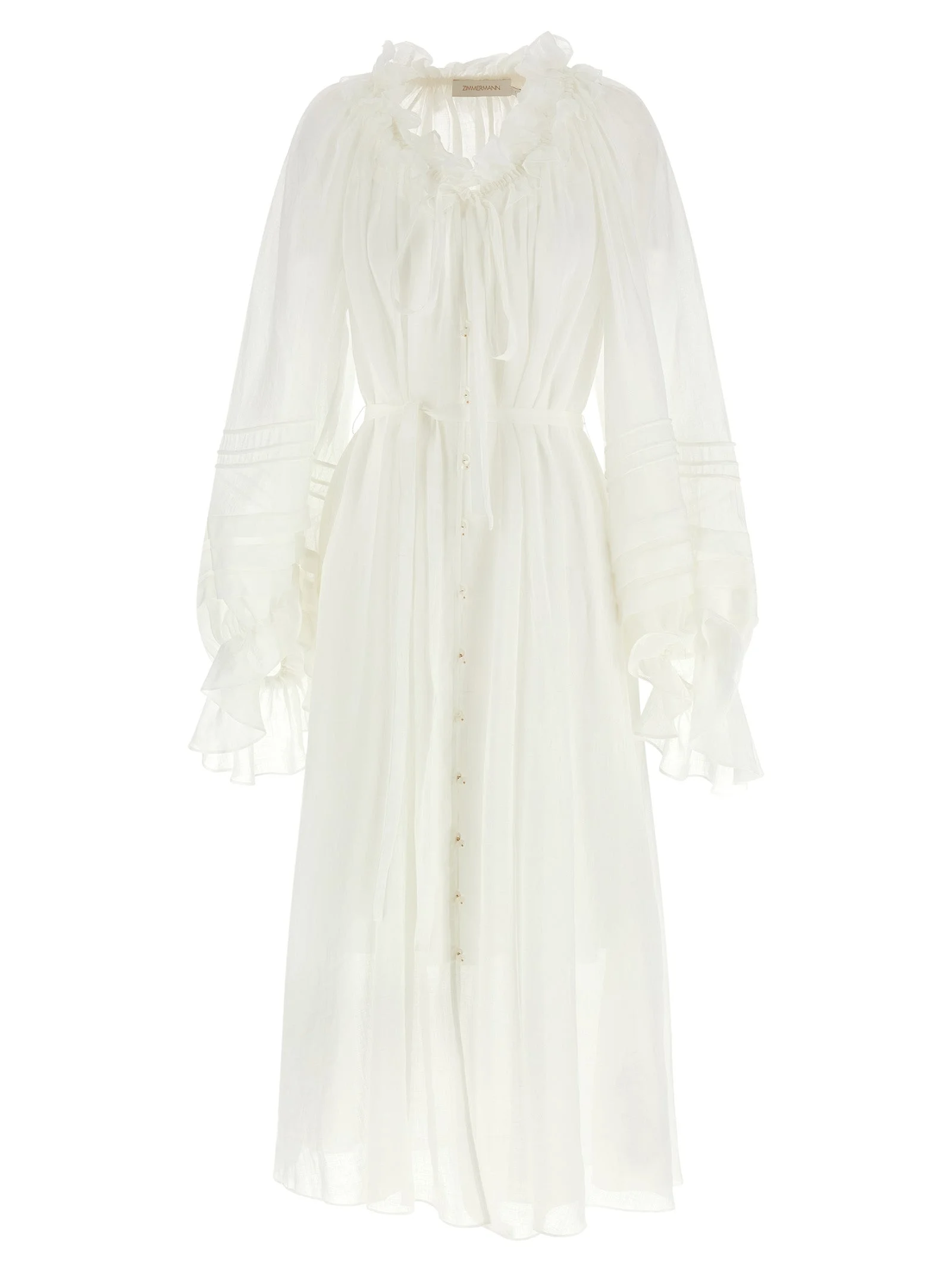 Long ramie Billow Rebellion dress, ruffle collar finished with lavalliere with ruffles around the neck and asymmetric hem, front button closure, long puff sleeves with elastic cuffs, removable belt, removable petticoat. Twisted Romance Collection - Colour: White - Composition: 100% ramie - Country Of Manufacture: China - Dimension: true to size fit - MPN: 6930DC261IVO