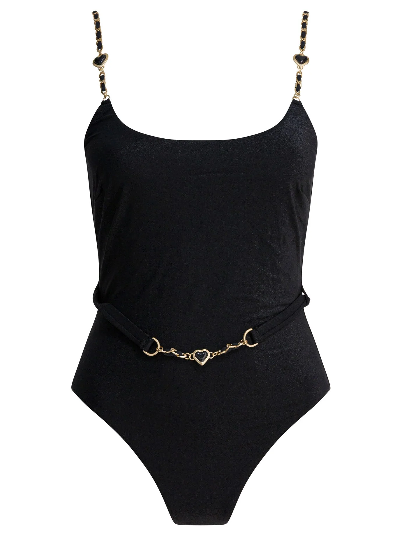 Zimmermann stretch-fabric "Daylight Chain Scoop" swimsuit, fitted structure with round neckline and attached waist strap. Thin straps feature integrated metallic details. The silhouette adheres to the body, supported by a technical composition that includes polyamide, metallic fibers and elastane, resulting in a stable fit and an even all-over profile. Construction elements emphasize support and structural linearity. - Solid color - Fixed waistband - Metallic details on the shoulder straps - Round neckline - Regular fit - Colour: Black - Composition: 54% polyamide 24% metallic 22% elastane - Country Of Manufacture: China - Extra Description: Solid colourRegular fit - MPN: 7059WRS263BLK