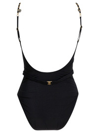 Zimmermann stretch-fabric "Daylight Chain Scoop" swimsuit, fitted structure with round neckline and attached waist strap. Thin straps feature integrated metallic details. The silhouette adheres to the body, supported by a technical composition that includes polyamide, metallic fibers and elastane, resulting in a stable fit and an even all-over profile. Construction elements emphasize support and structural linearity. - Solid color - Fixed waistband - Metallic details on the shoulder straps - Round neckline - Regular fit - Colour: Black - Composition: 54% polyamide 24% metallic 22% elastane - Country Of Manufacture: China - Extra Description: Solid colourRegular fit - MPN: 7059WRS263BLK