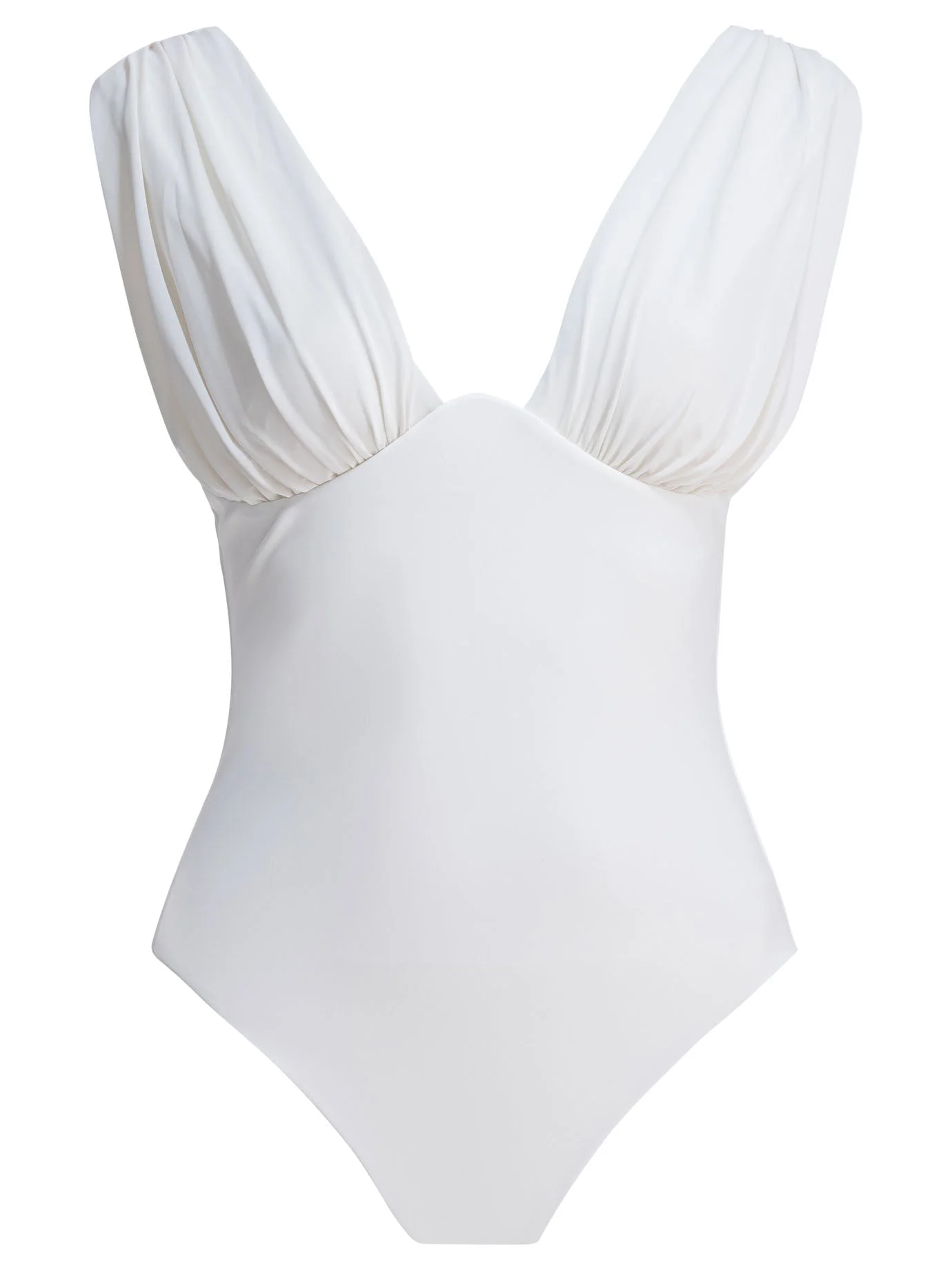 Zimmermann draped one-piece swimsuit with broad-shouldered structure and defined V-neckline. The main fabric is a blend of 75 percent polyamide and 25 percent spandex, providing stretch and support. The construction features a draped pattern positioned at the front, creating a figure-flattering fitted silhouette. The finish is clean, with barely visible seams and smooth edges. - Solid color - Draped motif at front - V-neckline - Wide shoulders - Stretchy polyamide and elastane fabric - Slim fit - Colour: White - Composition: 75% polyamide 25% elastane 75% polyamide 25% elastane - Country Of Manufacture: China - Extra Description: Solid colourSlim fit - MPN: 5099WRS261IVO