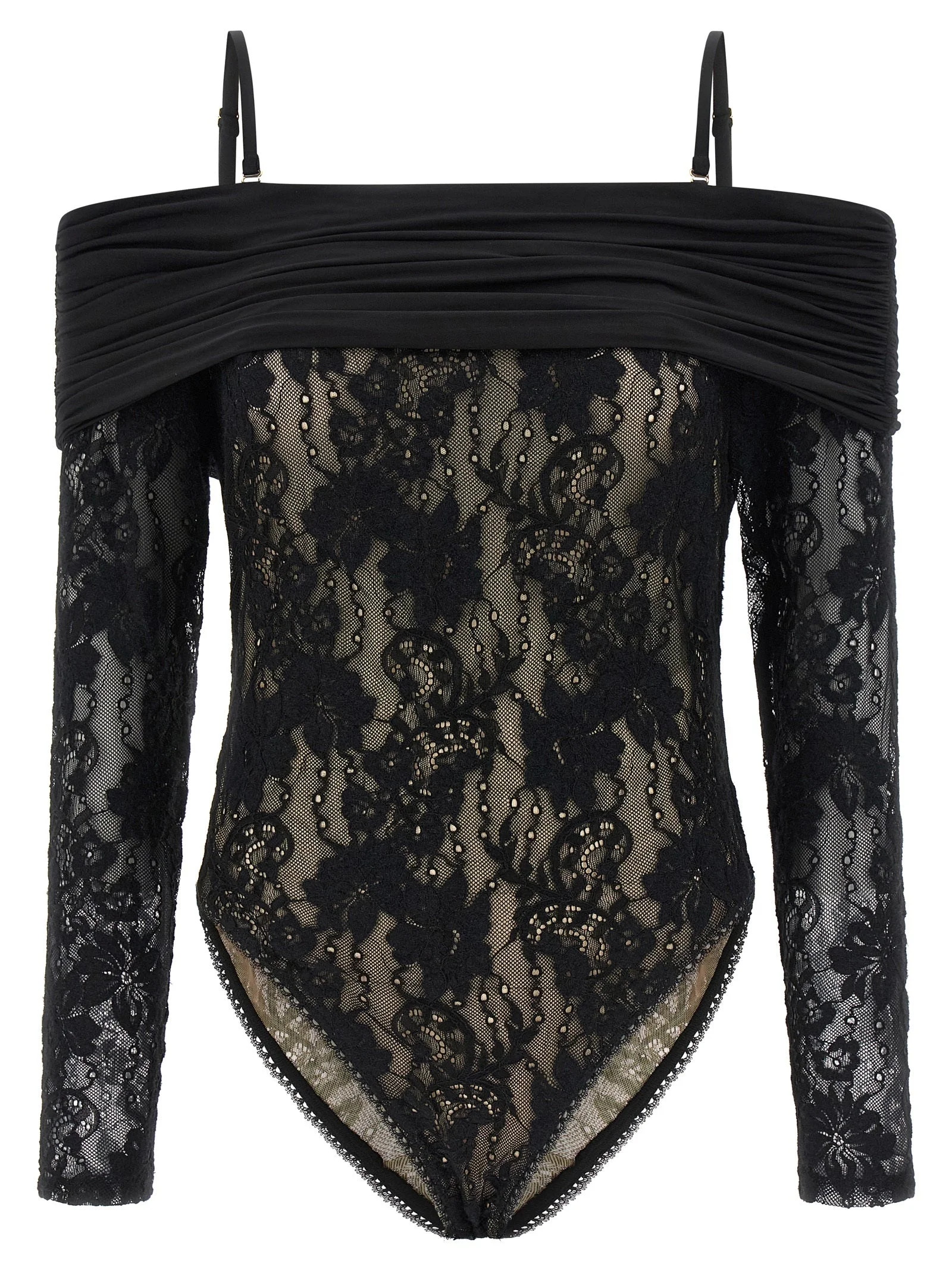 'Rebellion' stretch lace bodysuit with mesh lining, off-the-shoulder style with curled insert on the shoulders and draped cover, thin adjustable and removable straps, long sleeves, snap button closure on the hem. Twisted Romance collection. - Colour: Black - Composition: 90% polyamide, 10% elastane - Country Of Manufacture: China - Dimension: true to size fit - MPN: 7123TC261BLK