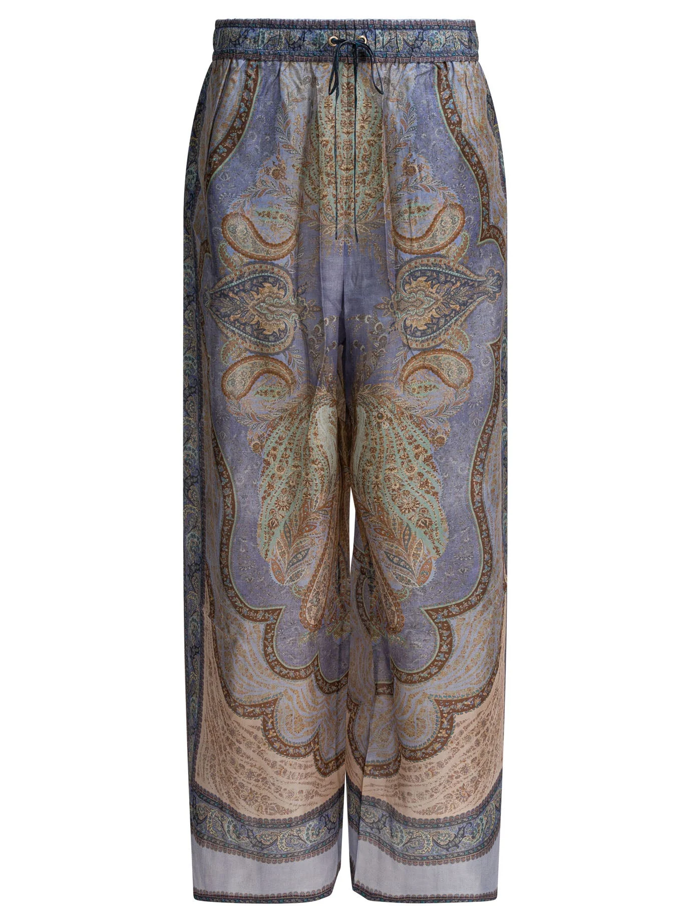 Zimmermann "Wanderlust" pants, made of silk habotai with a long leg construction and a mid-rise waist adjusted by a gathered drawstring. The wide silhouette maintains a relaxed fit, while the paisley print stands out throughout. Side pockets built into the seam and straight hem complete the garment, lending function and constructive simplicity. Clean finish on seams and functional waist detail. - Paisley - Mid-rise waist - 100% silk habotai - Drawstring waistband gathered - Integrated side pocket - Comfortable fit - Wide fit - Colour: Light blue - Composition: 100% silk - Country Of Manufacture: Vietnam - Extra Description: PaisleyWide fit;Mid waist - MPN: 5580PRS262TPBL