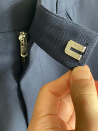 MSRP 1000+ Extra fine virgin wool in Navy with unbelievably complex waist construction. Riri zipper. Fully lined. Waist 15.5, outseam 40.5, leg opening 8.5 Thigh from crotch 12.