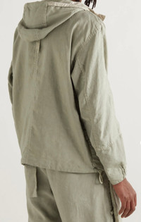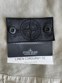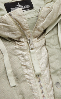 FABRIC RESEARCH AND TREATMENT SHORT PARKA_CHAPTER 1 LINEN CORDURA®-TC: Short Parka made from 54% Linen and 46% Cordura®, combining the characteristics of the vertical slub linen with the durability and shine of the Cordura® yarns. The depth of color in this material is emphasized by Stone Island’s double recipe garment dyeing process. A PFC-free anti-drop formula is added to the dyeing recipe. STYLE Wide articulated fit. Layered hood; the outer layer in Printed Linen Cordura® features a Glass Linen contour tunnel, with inner drawstring and a back horizontal drawstring, it also features a horizontal back cooling vent. The inner hood layer, attached to the outer hood through loop and snap, is made in run-proof cotton mesh edged in Glass Linen. V-shaped front with inner Glass linen inlay; the right side of the V integrates a wide pocket with hidden chrome zipper pocket, the left side integrates a wide snap-fastened pocket. The large hand pockets, with flap and snap fastening on a pull tape, overlap the hem of the jacket. The left sleeve hosts the half hidden Stone Island Shadow Project badge. Armhole vent with inner cooling cotton mesh inlay. Adjustable snaps at partly elasticized cuffs. Drawstring in the bottom hem. Two-way chrome zipper fastening. COMPOSITION External fabric: 54% Flax/Linen, 46% Polyamide / Nylon GARMENT DETAILS: 100% Flax/Linen - Coating: Polyurethane resin MESH: 100% Cotton TRIM: 100% Cotton CARE Wash at max 30°C - Mild cycle; Do not bleach; Do not tumble dry; Ironing maximum temperature 110°C - without steam; Do not dry clean; Line dry in the shade; Washing can alter color intensity, wash inside out, wash separately; Use neutral detergent; Remove detachable accessories before washing; Iron with a cloth between the item and the iron; Avoid direct contact of the iron on rubberized material.