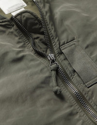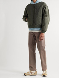 The most sought after Visvim Amplus fit for the stable. Military classic with a modern twist. Amami Ōshima Mud dye 100% nylon face with wool blend padding, linen wool blend trim. visvim's 'Thorsun III' bomber jacket is modelled after classic military styles, from the army-green shade and high-density nylon to the practical pocket arrangement. Padded for warmth, it has dropped shoulder seams and fastens with a Swiss Riri zipper. Army-green nylon Zip fastening 100% nylon; trim1: 100% cotton; trim2: 47% wool, 41% nylon, 12% linen; padding: 60% wool, 34% polyester, 6% rayon; lining: 100% rayon Dry clean Made in Japan