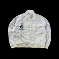 Vintage BMW Sicher Fahren Tactical Jacket Multi Pocket Authentic vintage BMW Sicher Fahren tactical jacket featuring bold German typography on the back reading “Getragen vom Wind – Freiheit” (Carried by the wind – Freedom). This is a rare promotional / motorsport-style jacket with strong European automotive heritage appeal. Constructed with a lightweight yet durable outer shell, designed for functionality and style. Features multiple utility pockets, elasticated hem, snap-button collar, and clean industrial stitching throughout. The off-white / cream tone gives it a timeless vintage look that pairs perfectly with denim or techwear fits. Branded with BMW logo embroidery on the chest, making this piece highly collectible for BMW enthusiasts, motorsport collectors, and vintage archive hunters. A true statement jacket that rarely surfaces in this condition. Perfect for: BMW collectors Vintage motorsport & racing fans Tactical / utility fashion lovers Archive & museum-grade collectors Measurements Chest / Pit to Pit: 27.5 inches Length / Shoulder to Hem: 26 inches (Please compare measurements with your best-fitting jacket.) Condition & Notes Overall condition: Good vintage condition Light natural aging consistent with age No major stains, holes, or structural damage Graphics and embroidery remain solid and readable Shipping: 🌍 Paid shipping (worldwide) — reinforces archive positioning Why buy from WAROENGKARTINI45_? Official Grailed Global Top 0.1% Seller Worldwide Express Shipping via DHL Express Trusted by 800+ elite international collectors