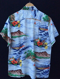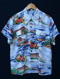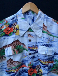 vintage hawaiian shirt two pocket loop collar royal hawaiian sun surf kamehameha oniwa soto tag : royal hawaiian tag size : 38 MEASUREMENTS chest / pit to pit : 23 inches length / shoulder to hem : 27.5 inches gently used vintage condition, see picture carefully please leave your phone number while purchasing, we need it for shipping terms THANKS & STAY SAFE ... some of the goods are waiting to be yours